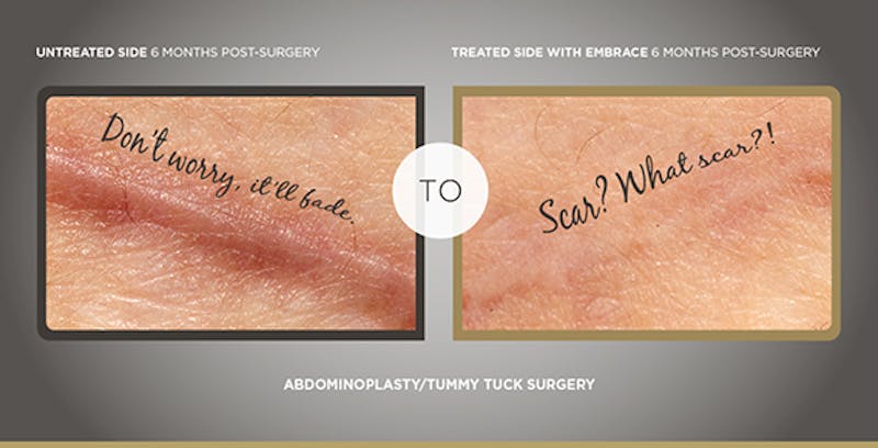 EMBRACE scar therapy is a silicone sheet that shields the incision and gently draws together both sides of a closed incision, relieving skin tension for a thinner, smoother, lighter scar and significantly reduces the appearance and texture of scars. Each sheet is typically applied 2-4 weeks after surgery on a closed, dry incision and is used for a minimum of 8 weeks.