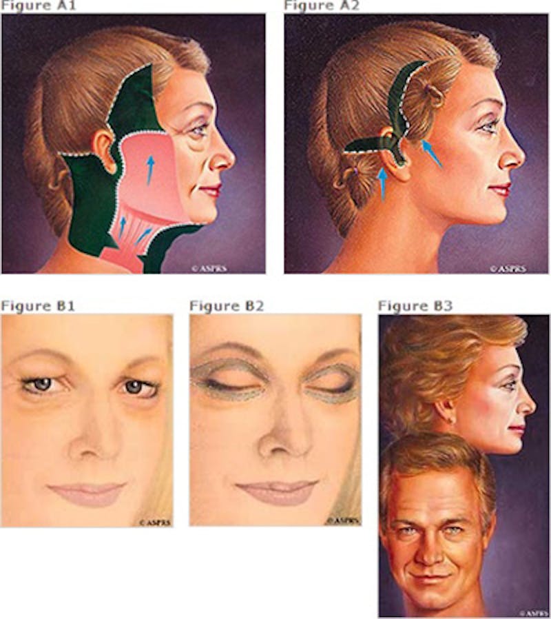 A Facelift tightens facial muscles and skin using small incisions usually made behind the ears. Excess tissue is removed, and remaining tissue is pulled taught. Tissues beneath the skin are expertly repositioned, and fine sutures reconnect the skin at the hairline and behind the ears. The surgery ultimately removes wrinkles and hanging skin from the cheeks, jowls, and neck. It gives patients a more youthful, wakeful appearance.